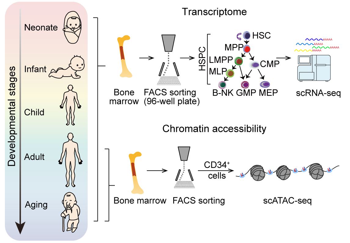 We harvested bone marrow-derived HSPCs from 11 healthy donors at the neonate, infant, child, adult and aging stages. HSPCs were labeled with canonical surface markers representing 8 CD34 + cell populations, including hematopoietic stem cell (HSC), multipotent progentior (MPP), lymphoid-primed multipotent progenitor (LMPP), multi-lymphoid progenitor (MLP), common myeloid progenitor (CMP), granulocyte/macrophage progenitor (GMP), megakaryocyte-erythroid progenitor (MEP) and B-NK cell progenitor (B-NK).